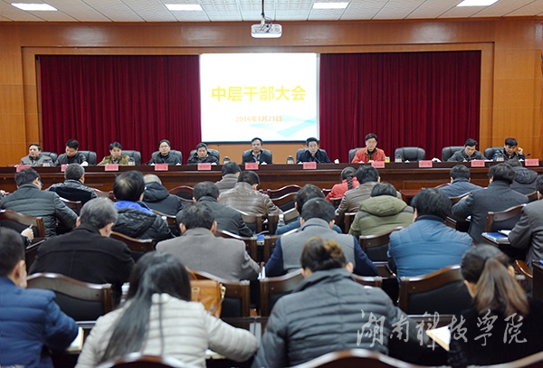 其他校领导唐艳明、宋宏福、彭立威、李常健、吴小林、程智开及袁先友、陈仲庚出席,全体中层干部参加会议。
