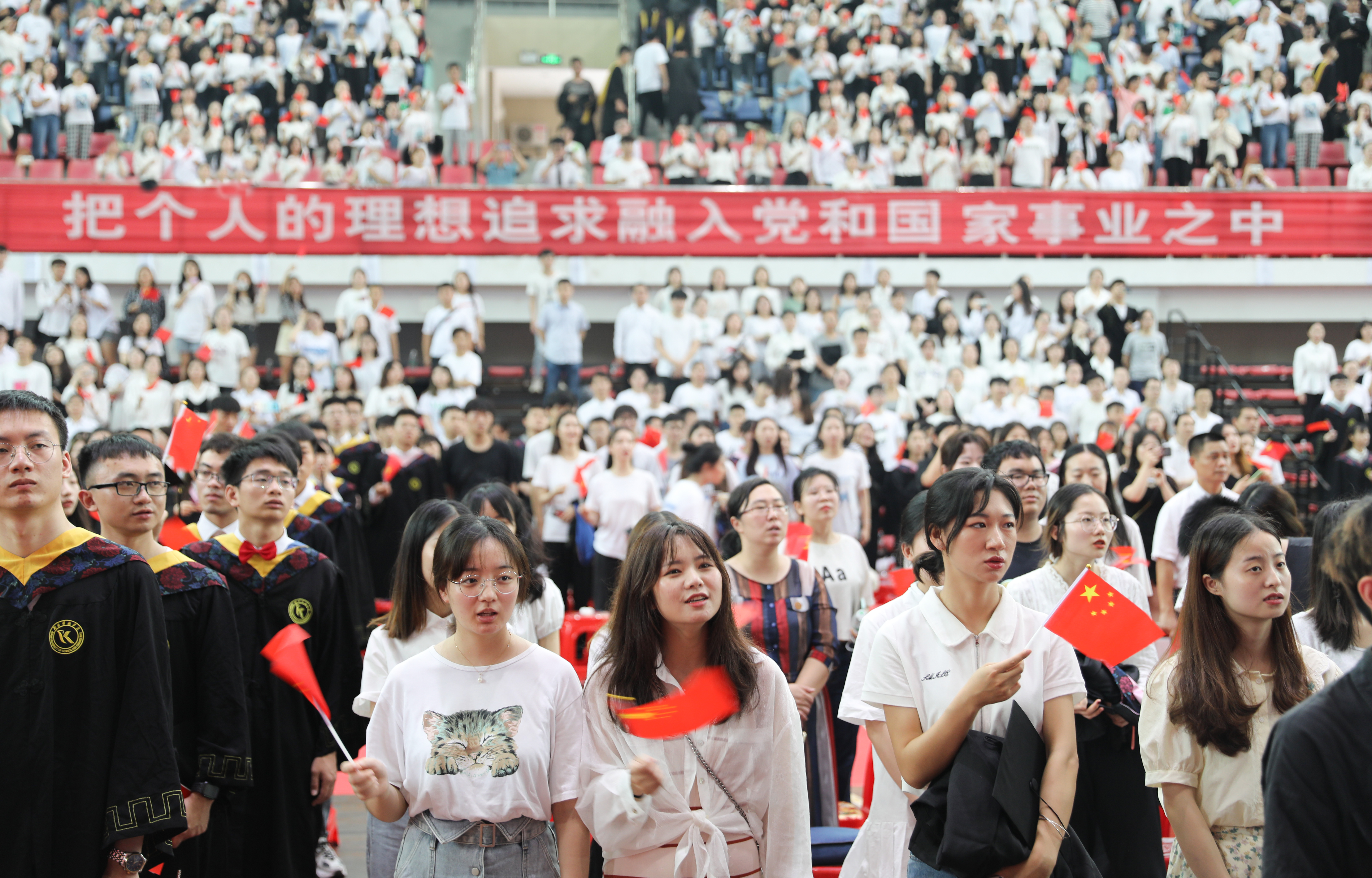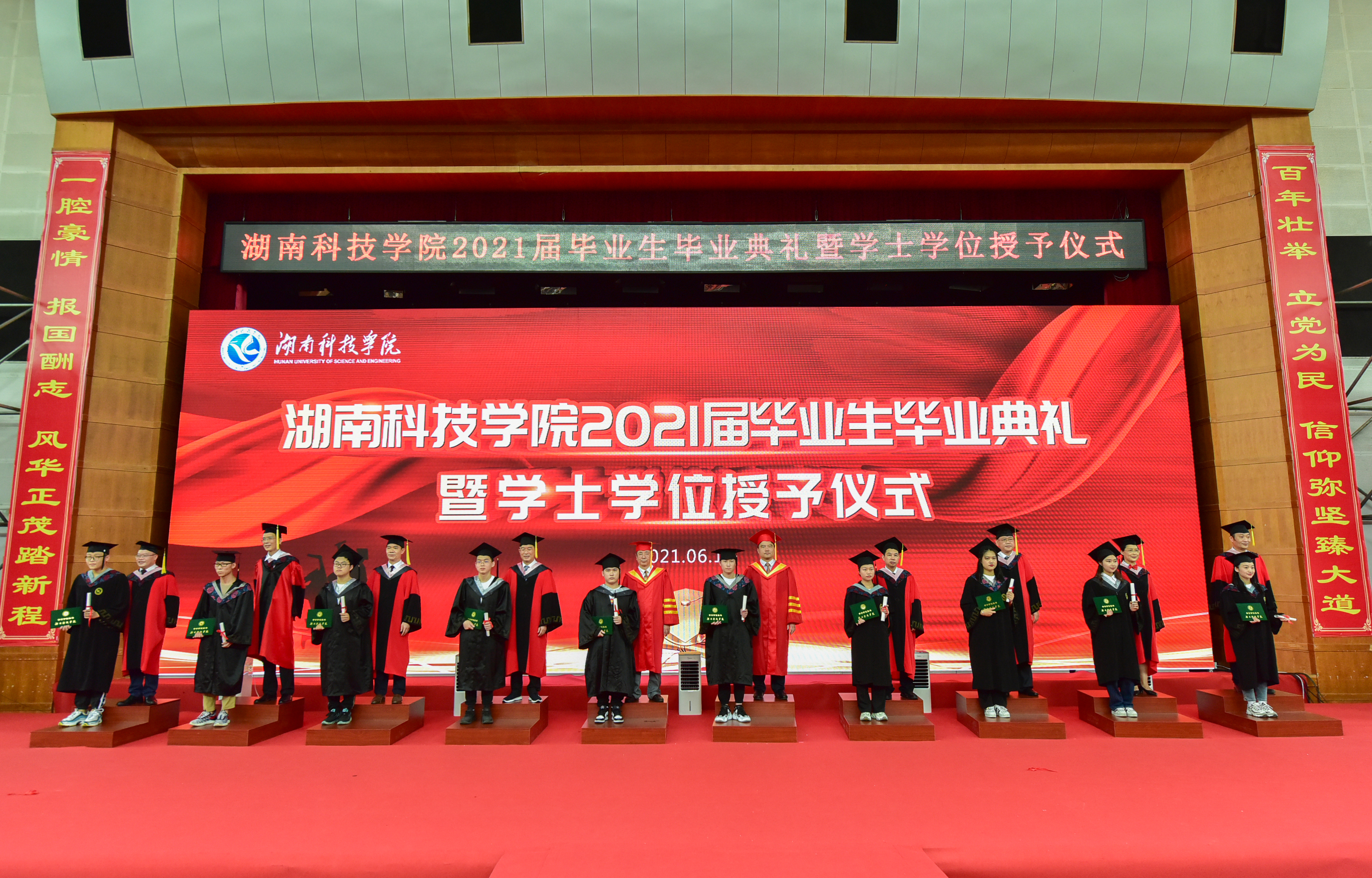 “百年壮举,立党为民,信仰弥坚臻大道;一腔豪情,报国酬志,风华正茂踏新程。”体育馆两侧的对联格外醒目,这是学校对全体毕业生的深切嘱托。