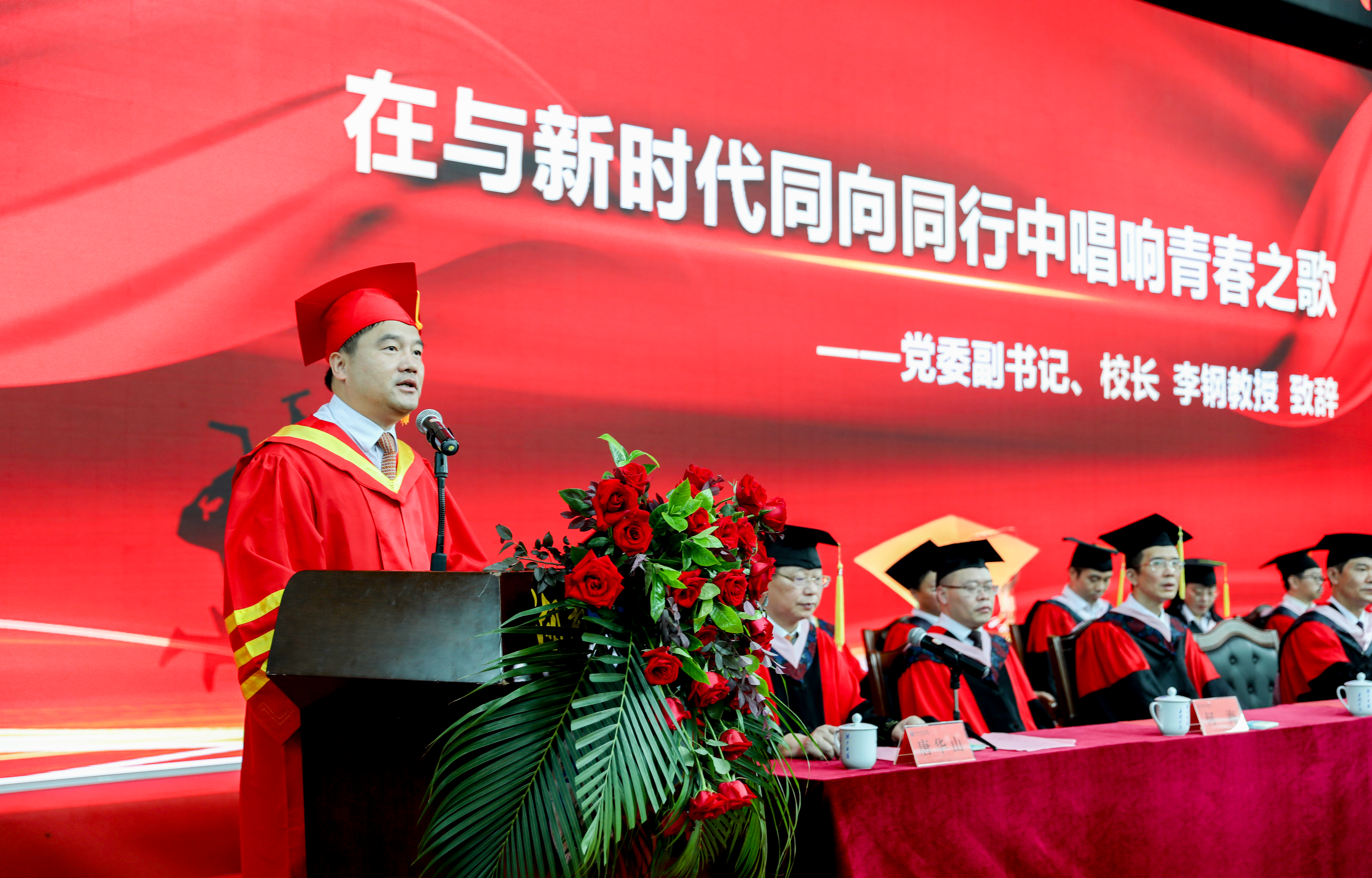 校长李钢作了题为《在与新时代同向同行中唱响青春之歌》的毕业致辞。他代表学校对同学们毕业表示衷心祝贺,为2021届毕业生上大学“最后一课”。他深情回忆了同学们四年来的点点滴滴,他热切关注着同学们的成长进步:勇夺“互联网+”创新创业大赛国赛铜奖的王鑫团队,斩获“挑战杯”全国大学生创业计划竞赛国赛铜奖的龚怡旭、周坤同学,荣获“中国大学生自强之星”称号的胡慧婷同学,荣获湖南省大学生党史知识竞赛一等奖的干娇娜同学,退伍复学积极发挥部队所学的陆宇荣同学,热心公益事业的范江涛同学……他说,大家用汗水写就的风采,以拼搏铸就的青春,汇聚成了助推学校发展的强大正能量,为大家点赞。