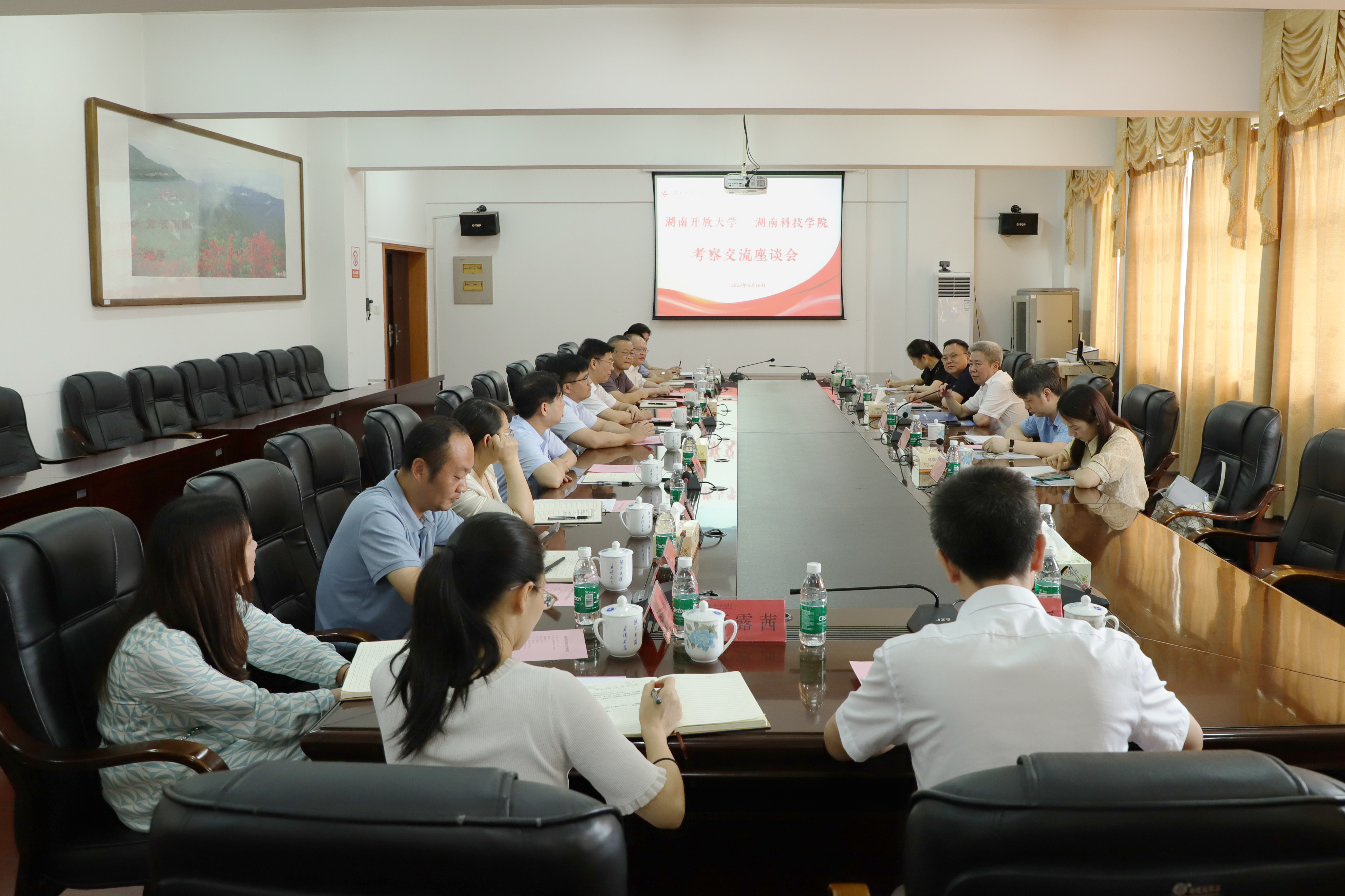 本网讯(记者 胡嘉旋)6月16日,湖南开放大学党委书记曾宝成一行5人来校考察交流。党委副书记、校长李钢,校领导宋宏福、李常健、何福林、郑银芳、何海,党委委员、组织部部长杨涛出席座谈会。