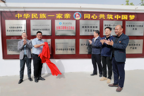 现场,湖南省人民政府副秘书长、援疆前方指挥部指挥长、吐鲁番市委副书记刘中杰,湖南省援疆前方指挥部副指挥长、吐鲁番市委组织部副部长、示范区党委副书记林亮亮与谢建伟教授、吐鲁番丝路明珠农业生物科技有限公司总经理王永旭、湖南吻野现代农业科技有限公司总经理罗令松共同为“爱体育网页版在线登录生物工程博士工作站”揭牌。