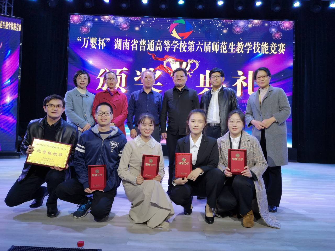 本网讯 11月21日,湖南省高校第六届师范生教学技能竞赛落下帷幕。我校选派的5名选手全部获奖。其中,理学院数学1702班杨学凤同学荣获中学理科组一等奖,物理1802班谢涛玲同学荣获中学理科组二等奖;化学与生物工程学院化学1702班郑婷同学荣获中学理科组三等奖;外国语学院英语1802班郑伊然同学、刘建辉同学分别荣获中学文科组三等奖。学校荣获优秀组织奖。