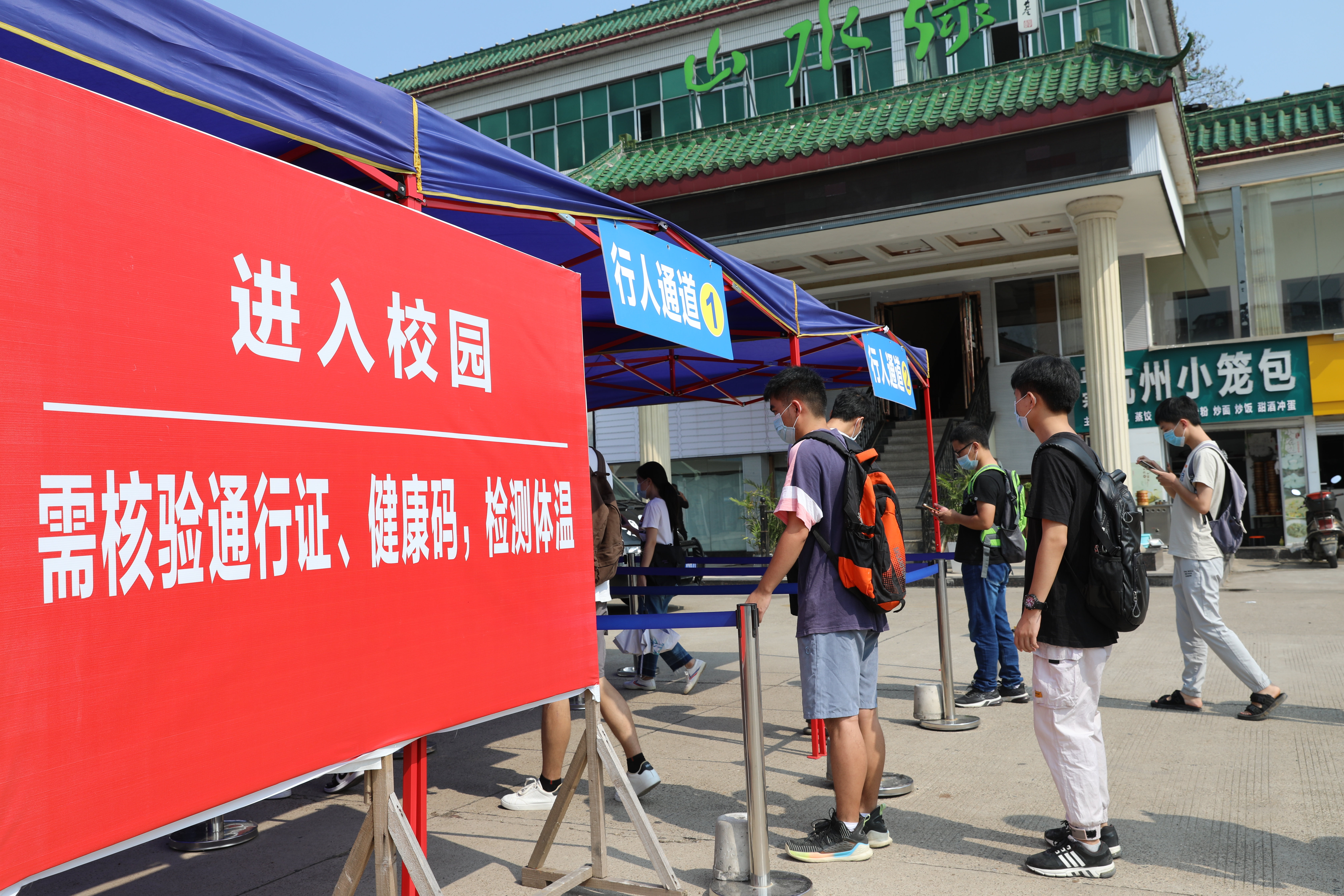 演练中,返校学生佩戴口罩按指示标识排队等候进校,每人间隔1.5米。经值班辅导员引导到“入校通道”,接受健康码核验,显示为绿色且无中高风险地区旅居史的学生,即可至东大门体温监测区进行体温检测,体温正常者可有序进校。如中高风险地区旅居史的学生,还需出示开学前7天内的核酸检测健康报告或相关的健康材料。