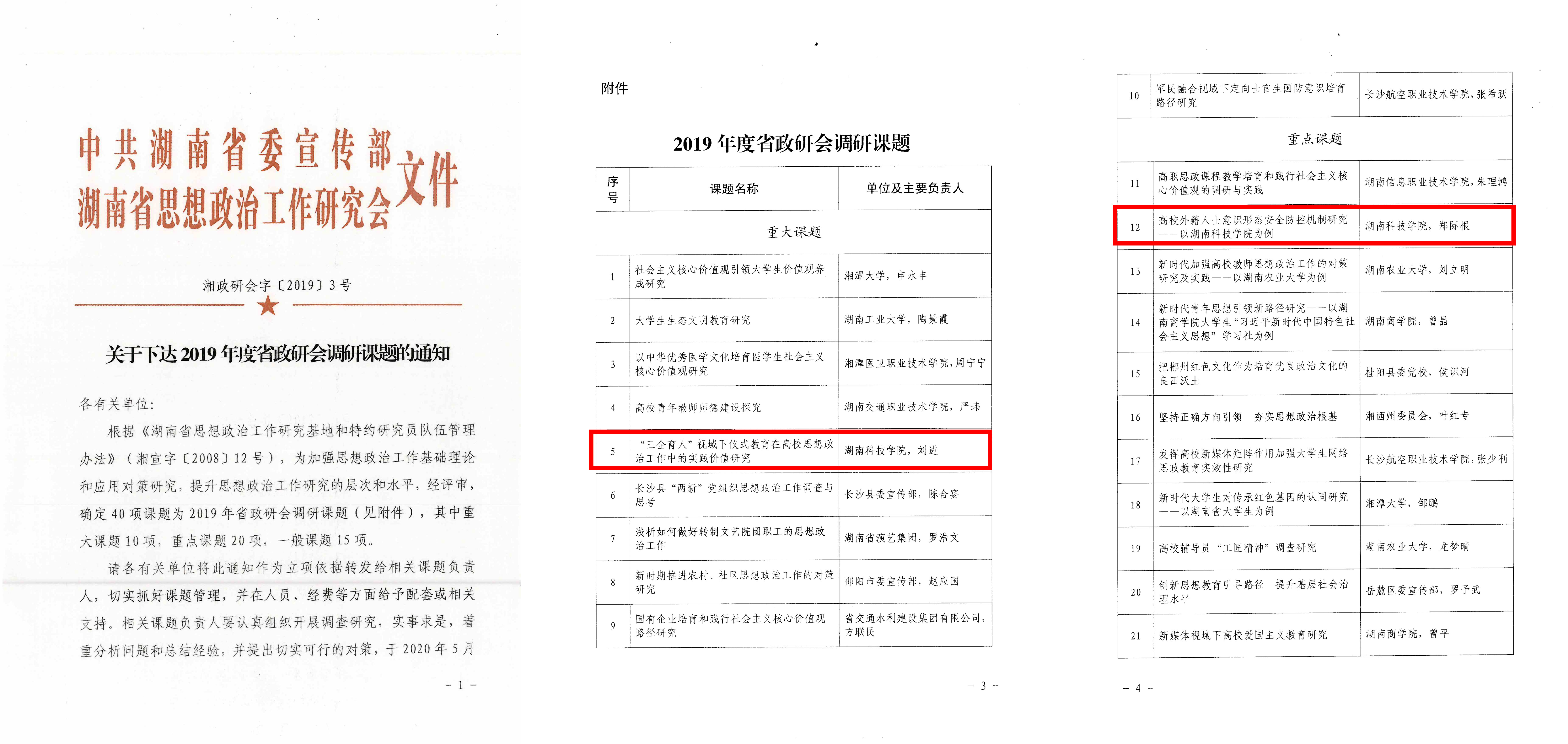本网讯 12月23日,中共湖南省委宣传部、湖南省思想政治工作研究会发布《关于下达2019年度省政研会调研课题的通知》,我校旅游与文化产业学院教师刘进申报的《“三全育人”视域下仪式教育在高校思想政治工作中的实践价值研究》获重大课题立项,国际交流与合作处处长郑际根申报的《高校外籍人士意识形态安全防控机制研究——以爱体育网页版在线登录为例》获重点课题立项。