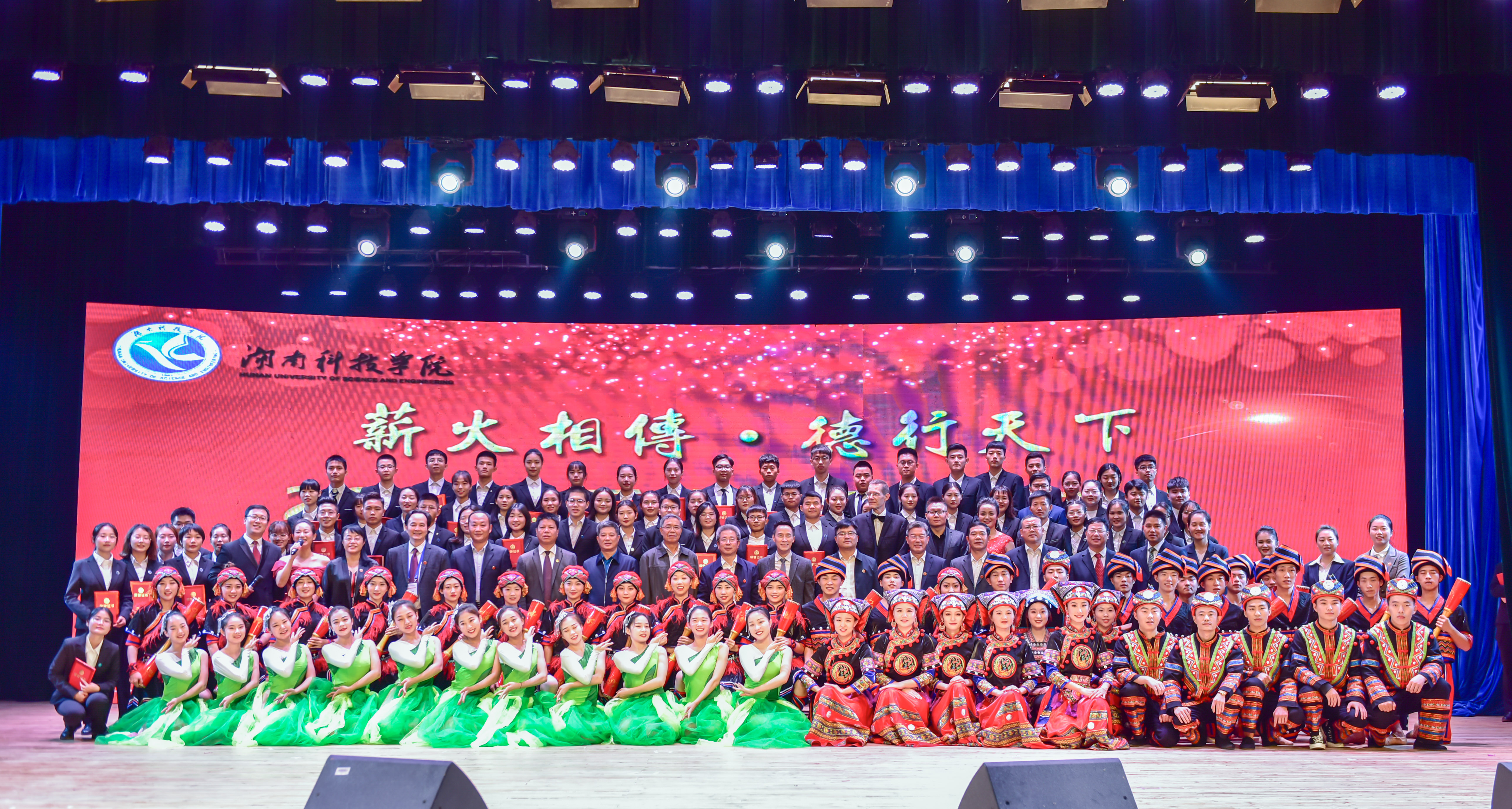 本网讯 七十八年春风化雨,七十八年立德树人。11月12日晚,正值学校建校78周年纪念日,学校举行“薪火相传·德行天下-爱体育网页版在线登录2019年舜德学子颁奖典礼”,100名优秀学子获表彰。本科教学工作审核评估专家广西师范大学原副校长钟瑞添、武汉音乐学院学科建设与规划办公室主任陈明,党委书记曾宝成,校长李钢,校领导唐艳明、宋宏福、彭立威、吴小林、程智开,党委委员、组织部长何福林,党委委员、宣传统战部长杨涛等参加颁奖典礼,并与学校师生共同观看表彰晚会。