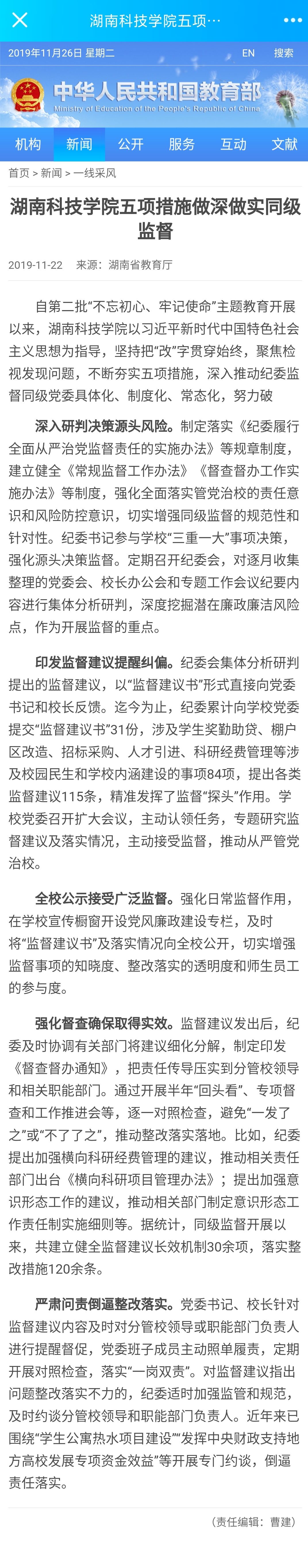 本网讯 11月22日,教育部官网以“爱体育网页版在线登录五项措施做深做实同级监督”为题,推介我校做深做实同级监督工作经验。