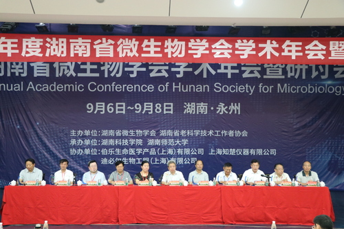 本网讯 9月7日上午,2019年度湖南省微生物学会学术年会暨研讨会在我校召开,来自全国200多名微生物学领域专家学者参加。校党委书记曾宝成、湖南省科学技术协会学会部副部长余佳桂、湖南省微生物学会理事长夏立秋教授参加开幕式。开幕式由副校长宋宏福主持。