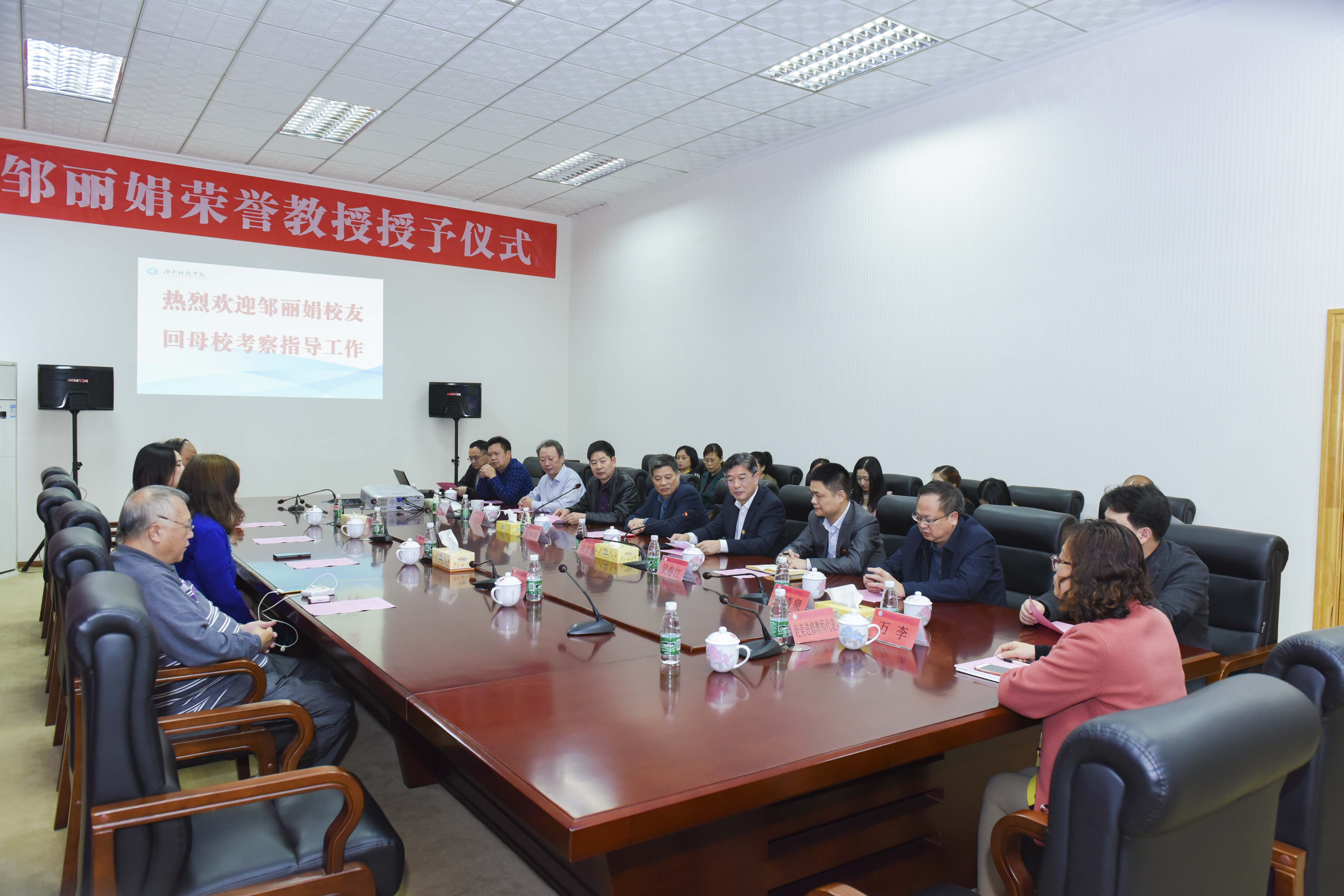本网讯  4月30日下午,学校授予我校外国语学院英语专业88届校友、广州联鸿海外集团、美国联鸿基金公司董事长邹丽娟荣誉教授称号。党委副书记唐艳明、副校长宋宏福及相关部门和学院负责人参加授予仪式。
