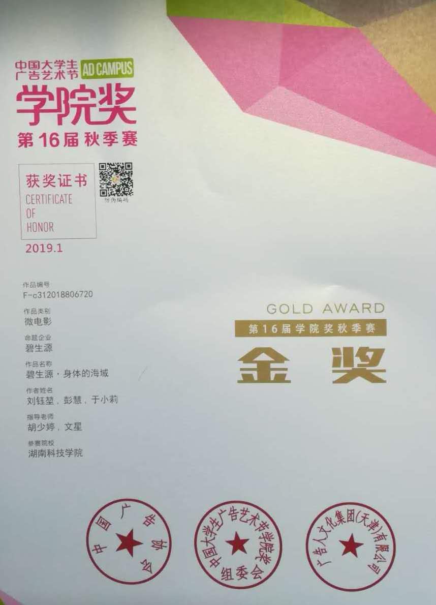 本网讯  1月10日,第16届中国大学生广告艺术节学院奖秋季赛创意盛典在北京梅地亚中心盛大举行。我校传媒学院刘玉堃、彭慧和于小莉同学创作的作品《碧生源,身体的海域》,在20多万件竞赛作品中脱颖而出,获得本次大赛微电影类金奖。指导教师胡少婷和文星老师分别获“金牌指导教师”荣誉称号。这是我校在这一赛事上的一大突破,也是本次大赛湖南省唯一获此奖项的高校。同时,传媒学院学子还获得优秀奖19项,佳作奖21项。