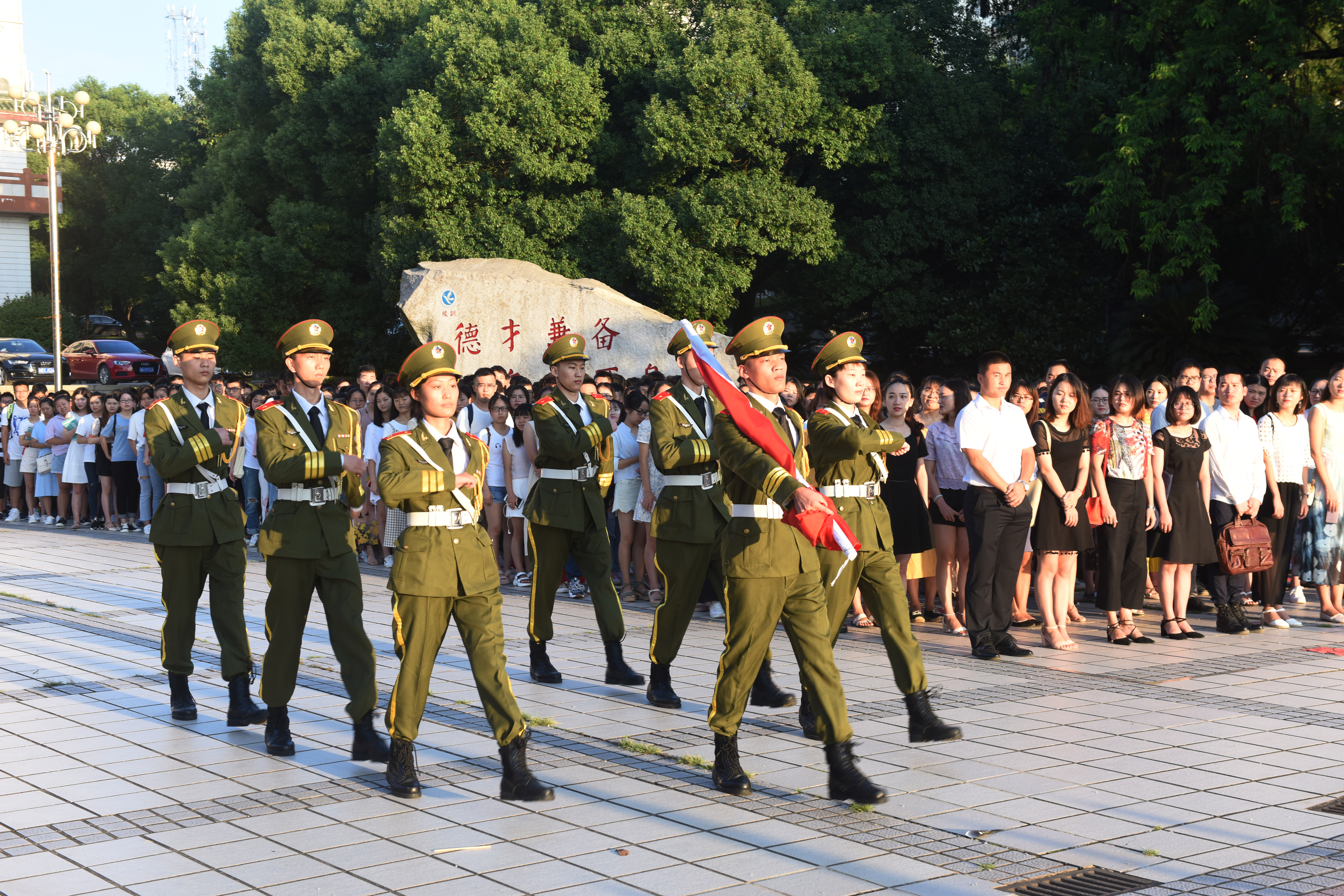 6时50分,英姿飒爽的国旗护卫队迈着整齐的步伐,护送国旗入场,伴随着庄严嘹亮的国歌声,五星红旗冉冉升起,迎风飘扬。在场的师生向国旗行注目礼,深怀着崇敬的心情,凝视着迎风飘扬的五星红旗。