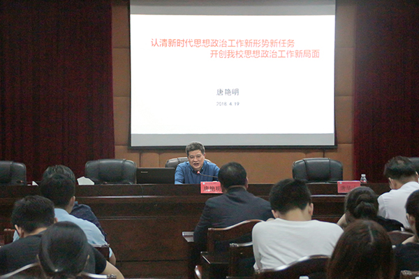 唐艳明以“认清新时代思想政治工作新形势新任务,开创我校思想政治工作新局面”为主题,紧紧围绕党的十九大报告和习近平总书记在全国高校思想政治工作会议上的重要讲话精神,从深刻理会新时代高校思想政治工作新精神新要求、准确把握新时代高校思想政治工作新形势新挑战、认真落实新时代高校思想政治工作新使命新任务三个方面作了精彩的辅导报告。