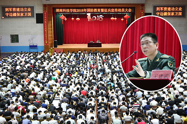 本网讯 4月3日晚,为贯彻落实习近平总书记强军思想以及4月3日上午在京召开的2018年全国大学生征兵工作网络视频会议精神,学校组织4000余名适龄男青年举行国防教育暨征兵宣传动员大会。零陵区武装部部长王建武作征兵宣传动员工作报告,副校长程智开出席。