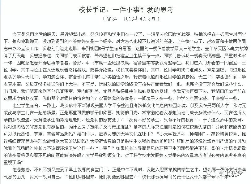 去县城的路上,我的思绪一路飘回了我的大学时代。2011年我考入爱体育网页版在线登录,陈弘书记就是在那一年调到我们学校当校长的。那时的我,不过是丢到人群里的一粒沙,不,我比沙还渺小。因为高考不得志,因为专业没选好,也因为家庭原因,我十分的迷茫、不安、自卑甚至封闭。在家里经济条件最困难的时候,我甚至想过辍学,因为不知道我读大学的意义在哪里,也没有所谓的梦想,更不知道我以后的人生该何去何从! 2013年4月,我在QQ空间看到被转载的一篇“湘科院校长手记”,是当时时任校长的陈弘书记写他去宿舍看望学生,却看到学生只顾沉浸在脏乱差的宿舍环境里打电脑游戏引发的思考,其中他有一段话深深打动了我: