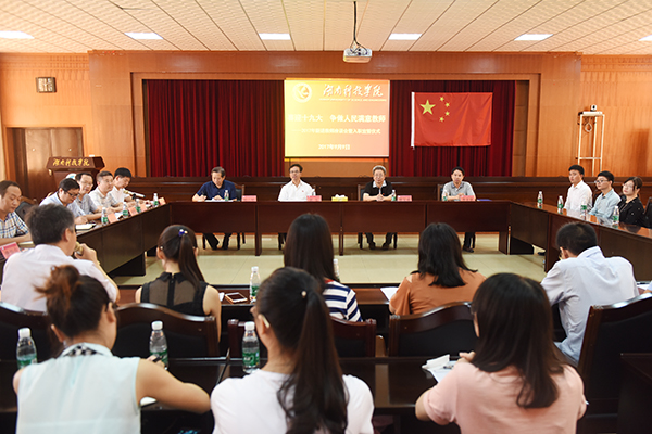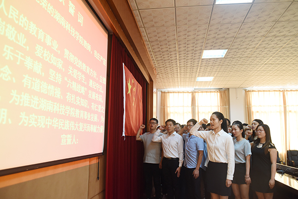 本网讯 “我志愿成为光荣的爱体育网页版在线登录教师,我庄严宣誓:忠诚人民的教育事业,贯彻党的教育方针……”9月9日上午,学校举行“喜迎十九大争做人民满意教师”主题座谈会,53名新进教师面对国旗庄严宣誓入职。党委书记陈弘以“地因人始重 校以师而名”寄语全体新进教师,努力成长为一名有理想信念,对教育有深刻理解的好老师。校长曾宝成、副校长郑山明、李常健出席。