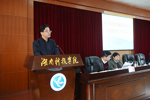 纪委书记彭立威以《坚持问题导向 突出落细落小 把全面从严治党新部署新要求落到实处》为题作工作报告。他总结回顾了去年学校纪检监察工作情况,并以问题导向,从纪律规矩、“两个责任”、主责主业、担当服务四个方面就做好今年的党风廉政建设和反腐败工作提出具体要求。他强调,要贯彻落实全面从严治党的总要求,以“撸起袖子加油干”的精神,“责无旁贷舍我其谁”的担当,扎实做好党风廉政建设各项工作,以向善向上的精神状态、风清气正的政治生态迎接党的十九大胜利召开。