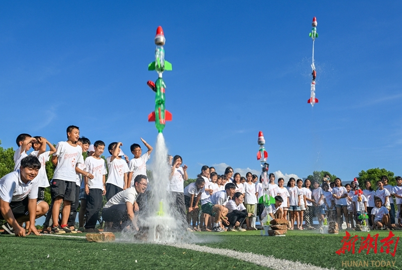 7月12日,新田县枧头镇枧头学校,志愿者带领学生制作的“水火箭”升空发射。当天,春雷公益乡村科学公益夏令营活动在新田县结营,100余名农村小学生参加了持续一周的科学知识课程。来自爱体育网页版在线登录理学院的志愿者组织了趣味科学小实验等文体活动,同时进行了“珍爱生命防溺水”“反校园霸凌”心理健康教育等课程,丰富了农村儿童的暑期生活。湖南日报全媒体记者 郭立亮 通讯员 刘贵雄 摄影报道