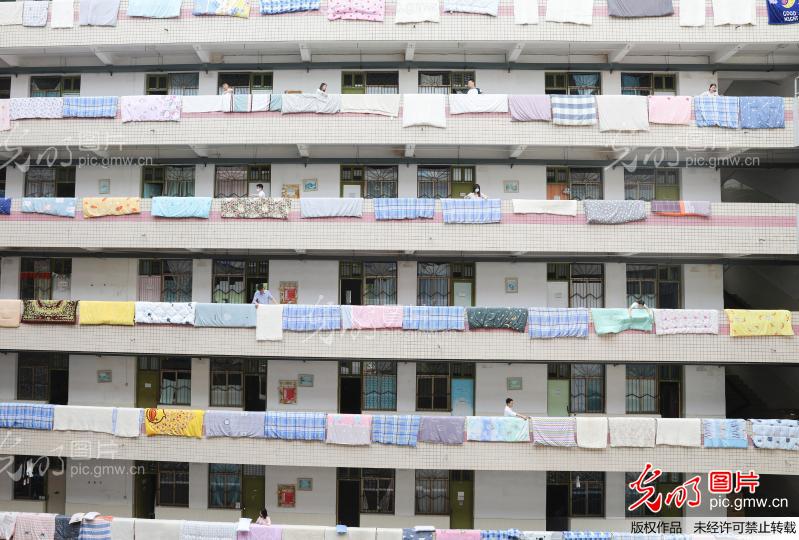 2020年5月8日,爱体育网页版在线登录学生公寓,辅导员在给学生晒被子。