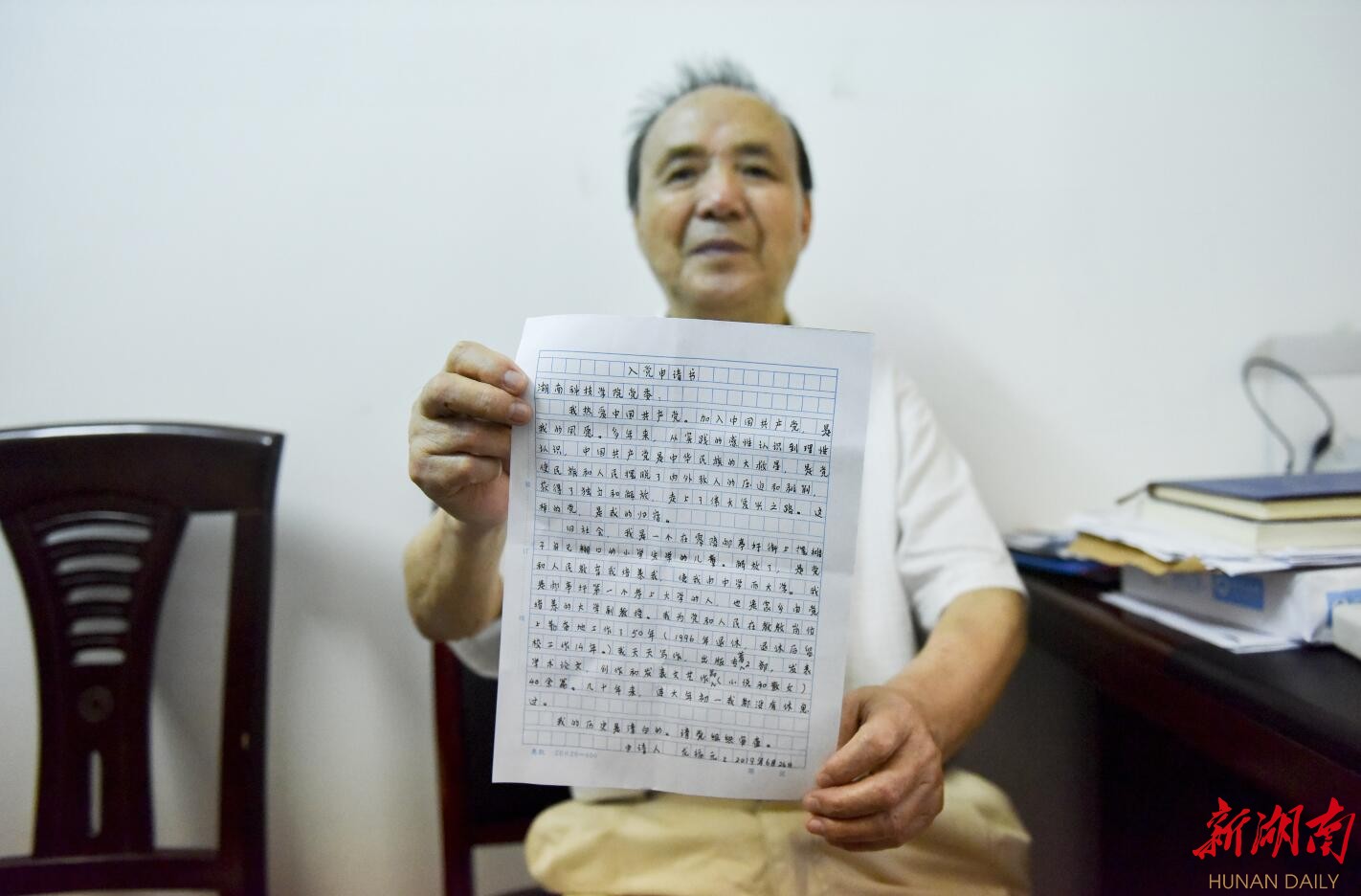 新湖南客户端6月27日讯(通讯员 李谌涵 夏汉伟 记者 左丹)“我热爱伟大的中国共产党,加入共产党是我毕生的夙愿……”6月26日一早,爱体育网页版在线登录84岁的老教师龙福元来到该校离退休处党总支办公室,郑重地向离退休处党总支书记刘剑非递交上他的入党申请书。