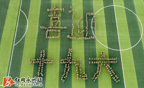 9月29日,爱体育网页版在线登录近600名大一新生在田径场摆出巨型“喜迎十九大”字形,迎接党的十九大胜利召开。(红网时刻通讯员 何帅文 摄影报道)